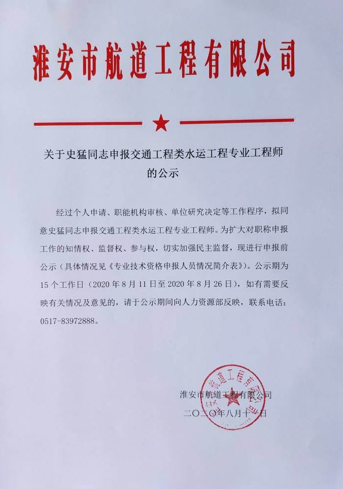 關(guān)于史猛同志申報交通工程類水運工程專業(yè)工程師的公示
